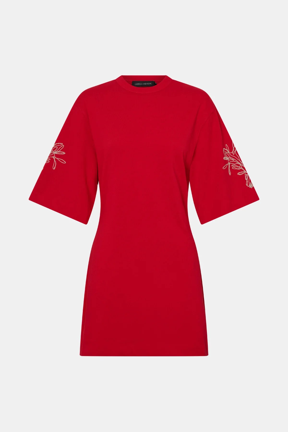 CAMILLA AND MARC Eviva mini dress in poppy red with beaded chainstitch embroidery. Strong shoulder, straddle stitch details, blind hem.