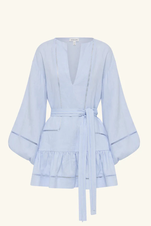 Balloon sleeve mini dress in sky in a premium linen with ladder trim detailing.