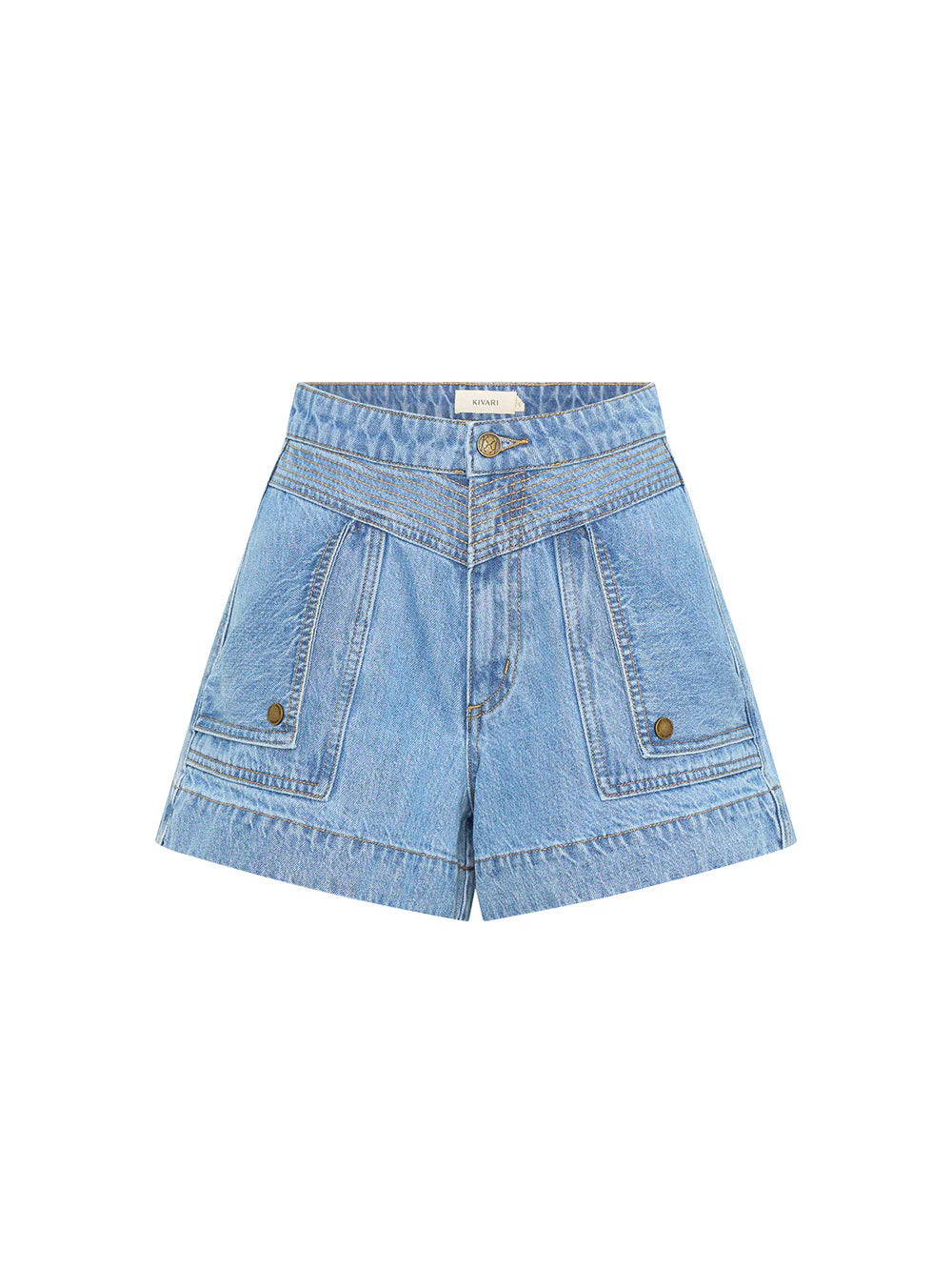 A modern essential, our signature Celene Denim Short in a light blue stonewash features contrast topstitching and panel detailing, front fold over pockets, complete with antique brass logo hardware.